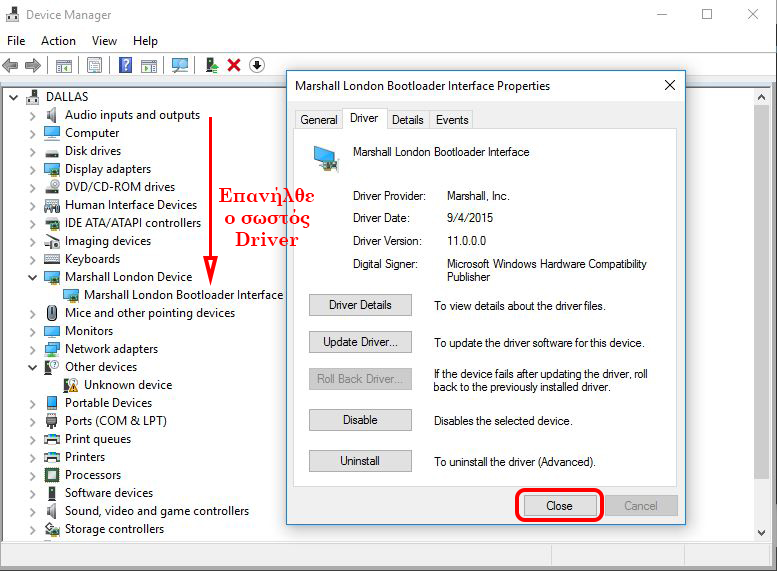 8 ) Πατάμε τώρα Close για να κλείσει αυτό το παράθυρο και μπορούμε να συνεχίσουμε κανονικά τις εργασίες μας στο CMD και να κάνουμε και flash και να περάσουμε TWRP χωρίς άγχος ότι θα γυρίσει στον λάθος Driver και θα χάσει την επικοινωνία. Στη παρακάτω εικόνα βλέπετε ότι επικοινωνεί μια χαρά το κινητό με τον υπολογιστή μετά την εφαρμογή του Roll Back Driver: