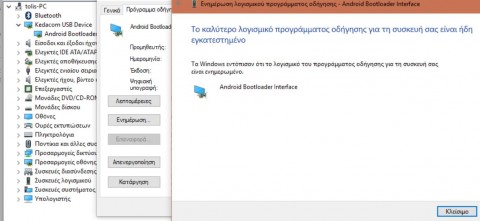 2) Συνδέουμε το κινητό και το βάζουμε σε fastboot mode. Στην αρχή θα φορτώσει τον σωστό Driver όπως φαίνεται στην παρακάτω φωτογραφία:
