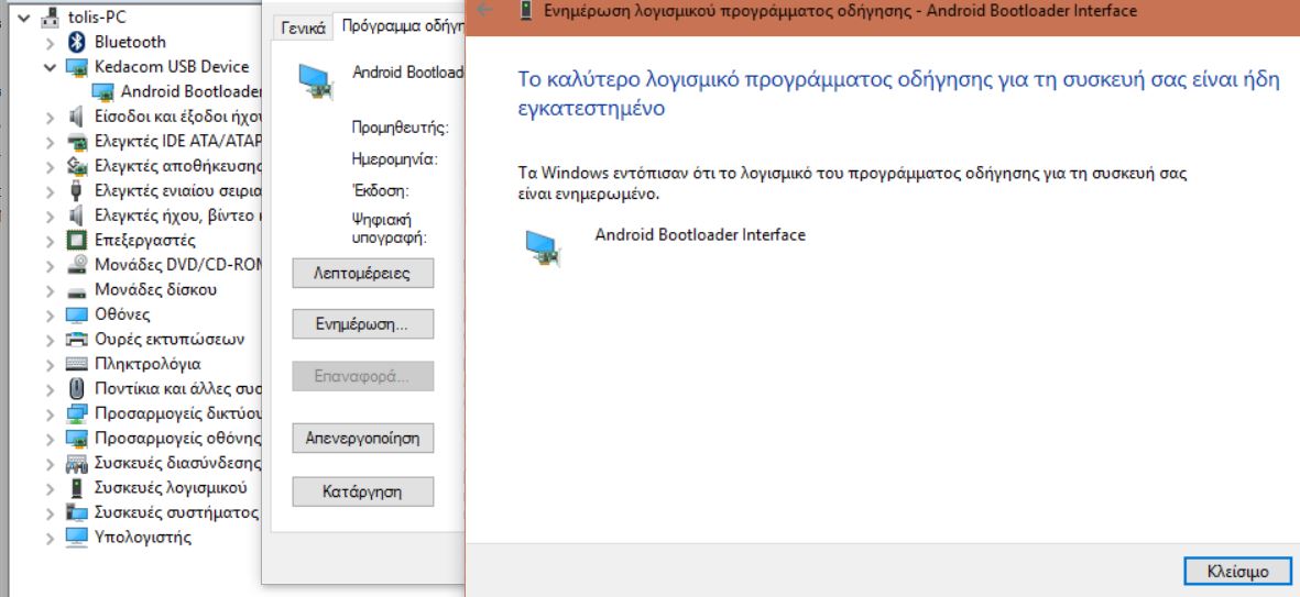 Δηλαδή ως "Kedacom USB Device". Με το που γίνεται αυτό χάνεται και η επικοινωνία του κινητού με τις εντολές fastboot και γενικότερα για να μπορέσει κάποιος να φλασάρει όπως μπορείτε να δείτε στην δεύτερη φωτογραφία. Έδινα την εντολή fastboot devices και δεν έστελνε τίποτα πίσω.