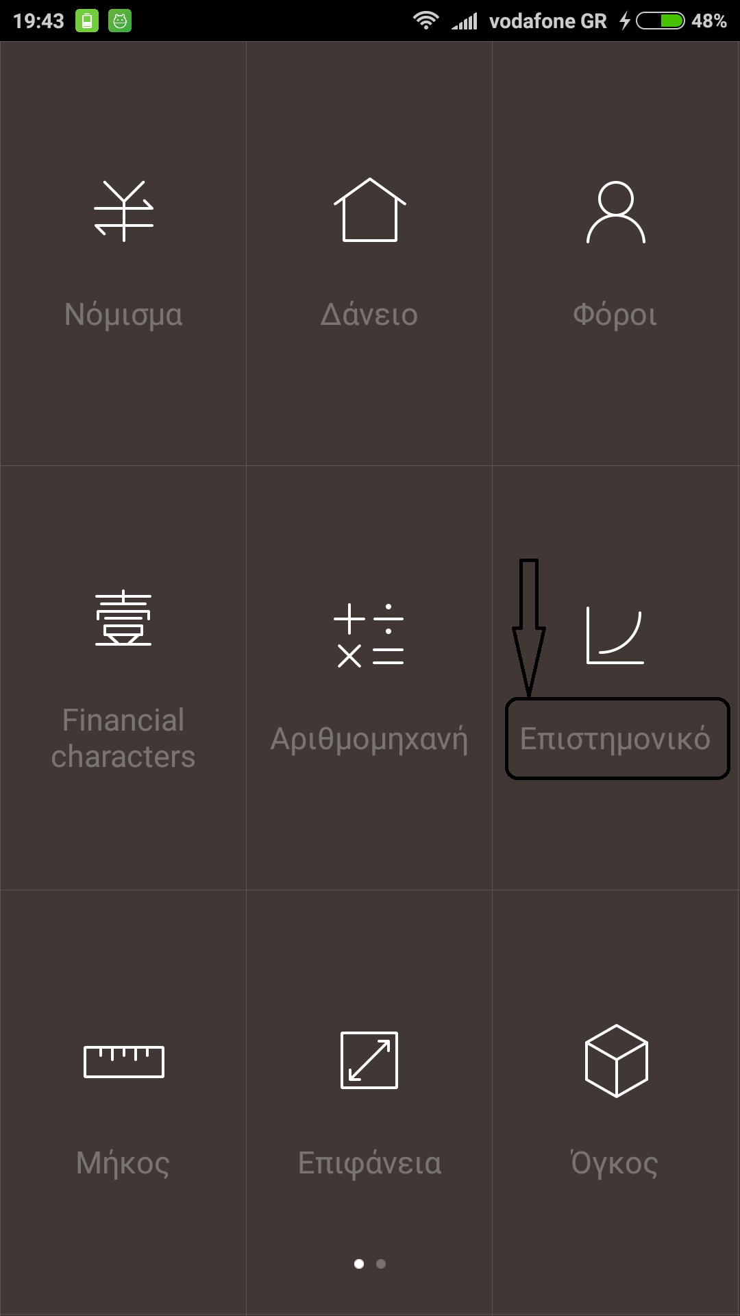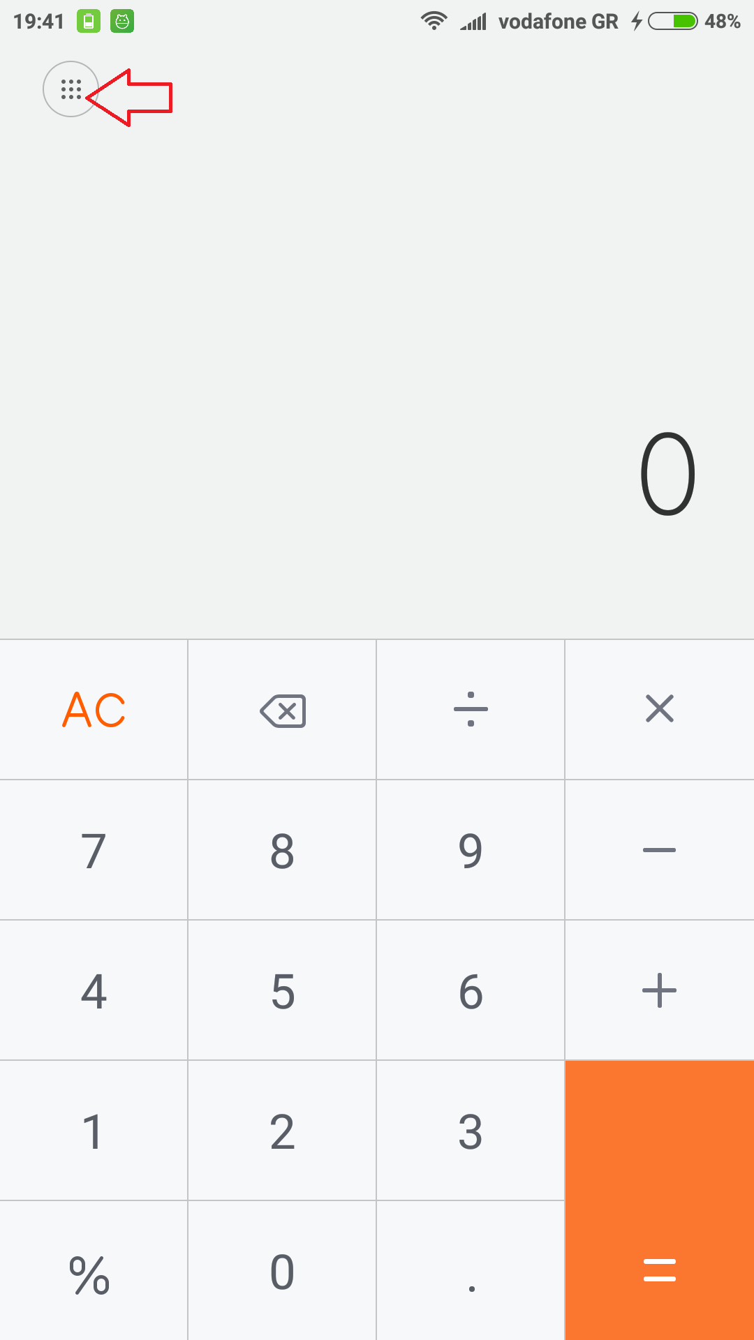 Πρώτα ανοίξτε την εφαρμογή αριθμομηχανή, όπως φαίνεται στην εικόνα και έπειτα κάντε κλικ στις 4 τελείες, θα δείτε την επόμενη σελίδα, όπως φαίνεται στην εικόνα και επιλέξτε επιστημονικά.