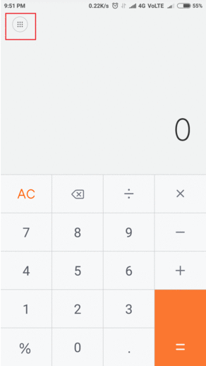 Πρώτα ανοίξτε την εφαρμογή αριθμομηχανή, όπως φαίνεται στην εικόνα και έπειτα κάντε κλικ στις 4 τελείες, θα δείτε την επόμενη σελίδα, όπως φαίνεται στην εικόνα και επιλέξτε επιστημονικά.