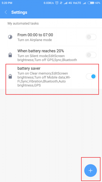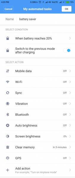 Όπως το όνομα καθορίζει, αυτό το χαρακτηριστικό μας βοηθά να δημιουργήσουμε ένα σύνολο κανόνων που η συσκευή σας θα εκτελέσει αυτόματα. Βασικά χρησιμοποιείται για να δημιουργήσει προφίλ μπαταρίας, όπως με MIUI7. Οι προγραμματιστές έκαναν και πάλι μία νέα βελτιστοποίηση σε αυτό, μας δίνει τη δυνατότητα να έχουν μια βαθιά ματιά σε αυτό.