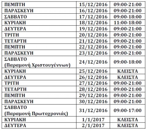 Από τον Εμπορικό Σύλλογο Θεσσαλονίκης ανακοινώθηκε το κάτωθι ωράριο λειτουργίας των εμπορικών καταστημάτων, κατά την διάρκεια των εορτών(φωτο 2)