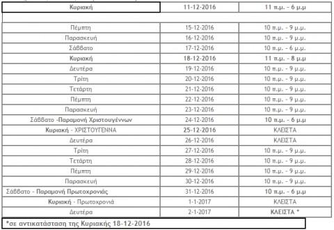 Η ΟΜΟΣΠΟΝΔΙΑ ΕΜΠΟΡΙΚΩΝ ΣΥΛΛΟΓΩΝ ΑΤΤΙΚΗΣ, ΟΜΟΡΩΝ ΝΟΜΩΝ και ΝΗΣΩΝ ΑΙΓΑΙΟΥ, σε συνεννόηση με τους Εμπορικούς Συλλόγους του Λεκανοπεδίου Αττικής Μέλη της και συντονίζοντας τις προτάσεις τους, ανακοινώνει προς το καταναλωτικό κοινό ότι, πέραν της Κυριακής 11 Δεκεμβρίου 2016, όπου με βάση την ισχύουσα νομοθεσία (Ν.4177/2013 αρ. 16 παρ. 1β) επιτρέπεται η προαιρετική λειτουργία των εμπορικών καταστημάτων, με προτεινόμενο από τα μέλη ωράριο 11:00-18:00, το συνεχόμενο διευρυμένο Εορταστικό Ωράριο Χριστουγέννων-Πρωτοχρονιάς, αρχίζει την Πέμπτη 15 Δεκεμβρίου 2016(φωτο 1)