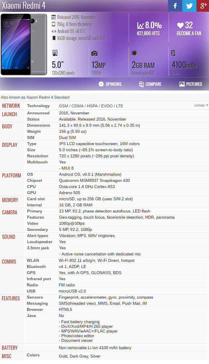 Τεχνικά Χαρακτηριστικά Redmi 4