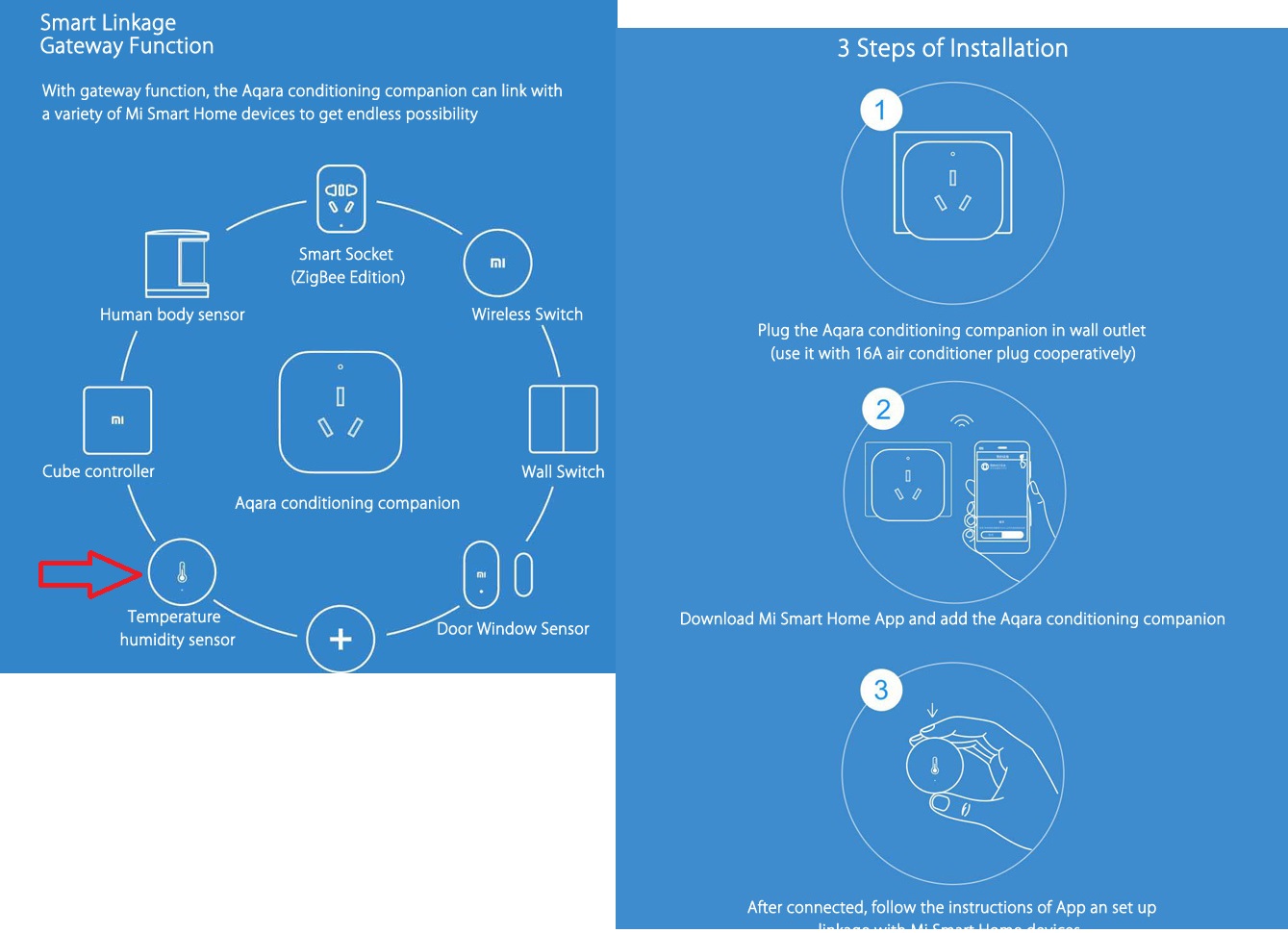● Plug the Aqara conditioning companion in wall outlet (use it with 16A air conditioner plug cooperatively)