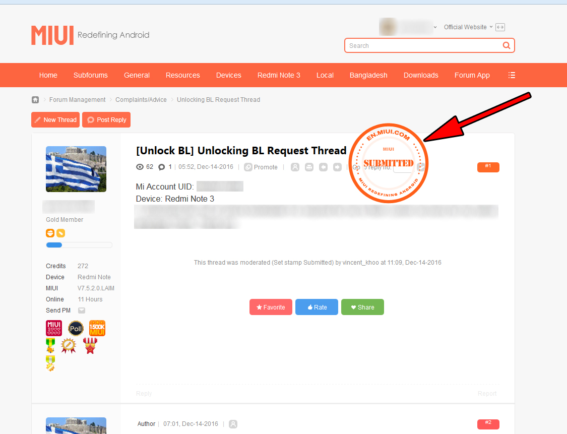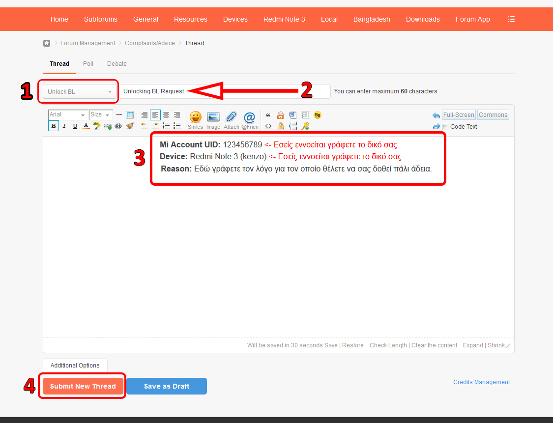 1) Το πρώτο βήμα που έχουμε να κάνουμε μόλις αντιληφθούμε ότι έχει ανακληθεί η άδεια που είχε ο λογαριασμός μας είναι να πάμε στο ξένο φόρουμ στην κατηγορία Complains και να ανοίξουμε ένα θέμα με τον τίτλο "Bootloader-Unlock"