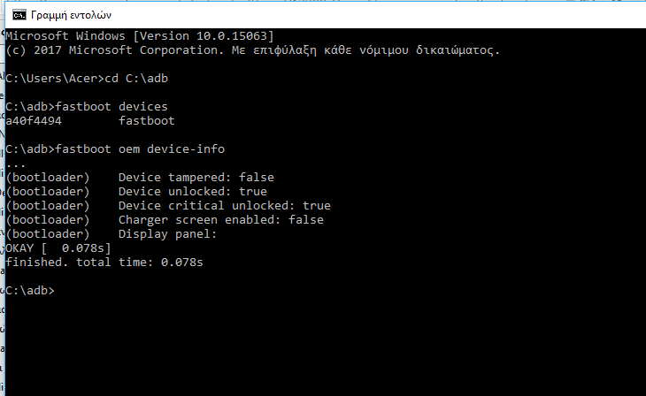 10. Γυρνάμε στο παράθυρο του DOS, πληκτρολογούμε fastboot reboot bootloader. Περιμένουμε να κλείσει η συσκευή και να ξεκινήσει σε fastboot.