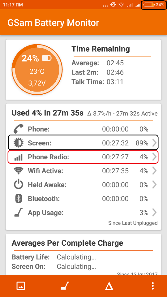 Επίσης από τις φώτο βλέπω ότι αν και 79% το αναμονή GSM, έπεσε από το 29% στο 24% με 27 λεπτά ανοικτή οθόνη.