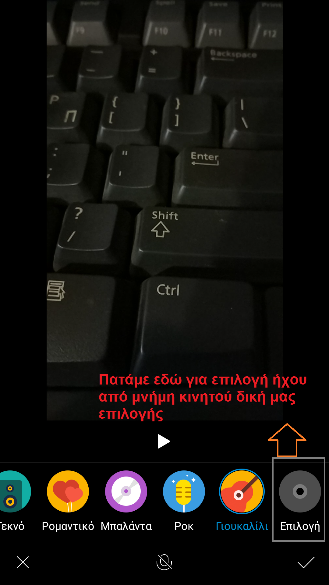 Μπορούμε επίσης να προσθέσουμε Ήχο στο βίντεο. Ο ήχος μπορεί να είναι τα προ-εγκατεστημένα audio ή μπορούμε να επιλέξουμε το αρχείο ήχου από τη μνήμη του τηλεφώνου μας. Επιλέξτε την τελευταία επιλογή με την οωομασία Επιλογή για να επιλέξετε τον ήχο από την μνήμη τηλεφώνου.