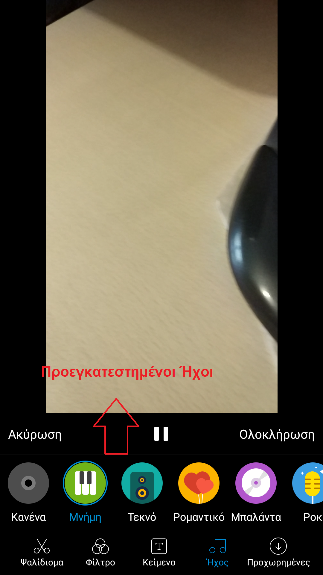 Μπορούμε επίσης να προσθέσουμε Ήχο στο βίντεο. Ο ήχος μπορεί να είναι τα προ-εγκατεστημένα audio ή μπορούμε να επιλέξουμε το αρχείο ήχου από τη μνήμη του τηλεφώνου μας. Επιλέξτε την τελευταία επιλογή με την οωομασία Επιλογή για να επιλέξετε τον ήχο από την μνήμη τηλεφώνου.
