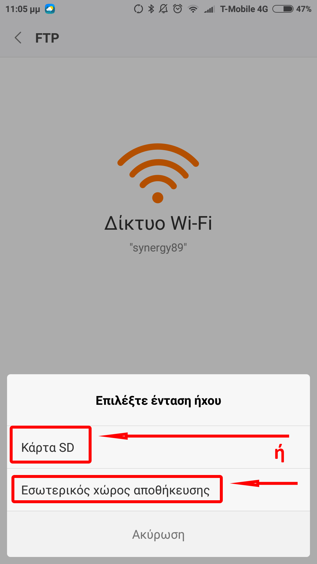 β) Αν όμως στο κινητό έχουμε SD Card τότε θα μας εμφανίσει την φωτογραφία στο παρακάτω spoiler και εμείς θα πρέπει να επιλέξουμε αν θέλουμε να έχουμε πρόσβαση στην SD Card ή στoν εσωτερικό χώρο του κινητού μας: