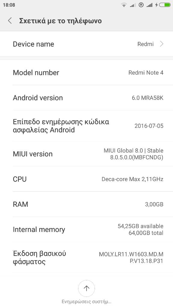 Γεια σας παιδιά θα ήθελα να σας πω ένα πρόβλημα αν και το έχω ξαναπεί έχω ένα redmi note 4 με αυτή την έκδοση miui global stable 8.0.5.0 (mbfcndg)παραθέτω και φωτογραφία προσπάθησα να το βάλω ελληνική rom με οδηγίες όπως λέει από εδώ (Flash την Ελληνική ROM στο RedMi Note 4 (Nikel) για πρώτη φορά.) το κινητό το έχω ξεκλειδωσει το εχω κάνει έλεγχο bootloader όλα καλά μέχρι εδώ από εκεί και μετά ακολούθησα τις οδηγίες όπως σάς και πριν μόλις συνδέω το κινητό μου ανοιχτό και βάζω το adb δεν λειτουργεί έχω drivers και τα λοιπά μόλις το κλείσω και το βάλω σε fastboot δέχεται κανονικά τις εντολές όταν λοιπόν πάω και βάζω την ελληνική rom μέσα στο τηλέφωνο δεν την βρίσκει στο twrp όταν την βάζω στην sd την βρίσκει κανονικά και αφοί έχω κάνει wipe και format γιατί μου έβγαζε κόκκινα γράμματα μόλις πατάω instal το κινητό κάνει επανεκκίνηση και ξαναπάει στη rom που είχε το κινητό δεν ξέρω αν κάνω κάτι λάθος και αν αυτές οι οδηγίες που βρήκα είναι οι σωστές και ποια είναι αυτή η rom που πρέπει να εγκαταστήσω παρακαλώ πολύ θα ήθελα ναμου δειξεται πληρως τελος εχω δοκιμασει και με το updater απο το official site με μια ρομ πιο καινουρια αλλα τα ιδια με κανει νερα