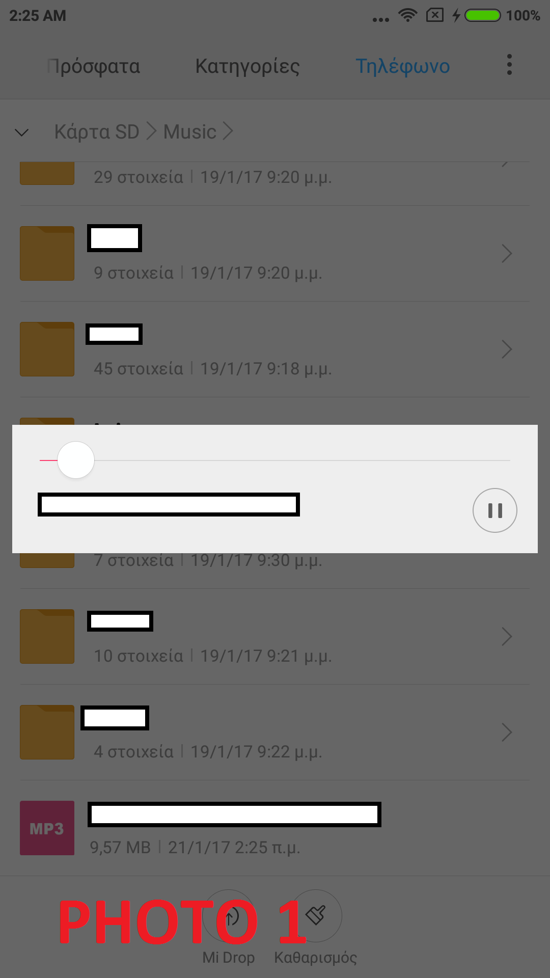 Καλησπερα σας, προσφατα αγορασα Xiaomi Redmi Pro και εβαλα την καρτα sd απο το παλιο μου κινητο στο καινουριο. Στην αρχη οπως διαβαζε τα αρχεια , οταν ανοιγα ενα τραγουδι ανοιγε με τον τροπο που βλεπουμε στην PHOTO 1, με κατι σαν mini player. Μετα απο λιγο, καθε φορα που ανοιγα ενα mp3, ανοιγε ολο το Music player οπως φαινεται στην PHOTO 2. Υπαρχει καποιος τροπος να ρυθμισω το κινητο ετσι ωστε οταν ειμαι στο file explorer και ανοιγω mp3, να ανοιγουν οπως στην PHOTO 1;