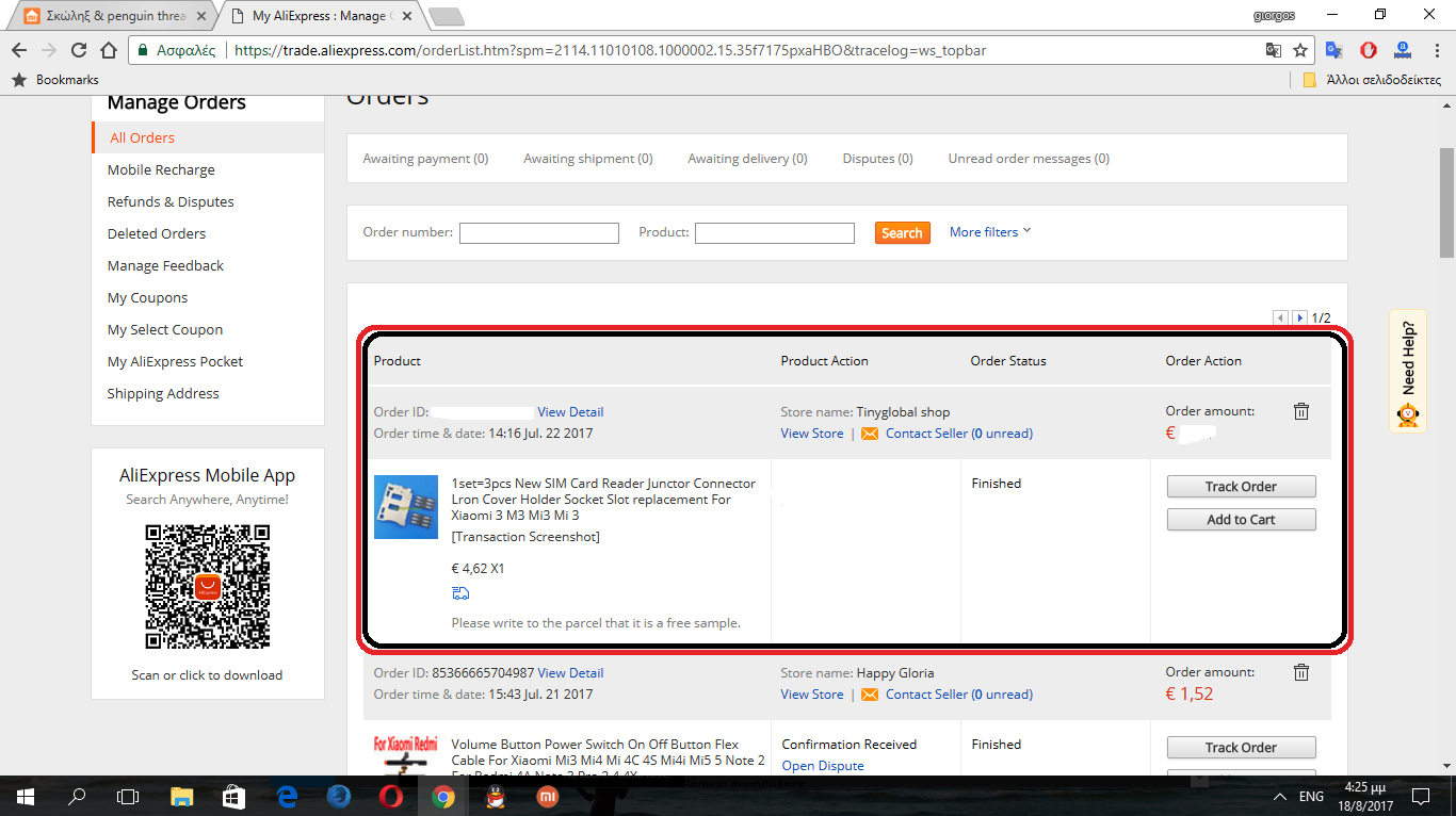 Λοιπόν έμπλεξα με το aliexpress έκανα την παρακάτω παραγγελία (φωτογραφία 1). Κοιτάζω που βρίσκεται προχθές και βλέπω ότι γράφει ότι παραδόθηκε την 10-8-2017. Εγώ εκείνη την ημέρα όμως δεν παρέλαβα τίποτα (φωτογραφία 2,3. Κοινώς το χάσαμε το δέμα πατριώτη. Έκανα dispute και τώρα είναι στην επεξεργασία αλλά δεν πιστεύω να κερδίσω κάτι.