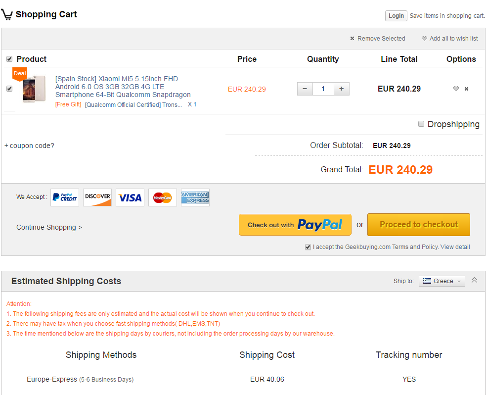 • Λοιπόν, και το honorbuy και το geekbuying έχουν έξτρα έξοδα αποστολής, όντως. Το είδα, αφού πάτησα "add to cart" και μού έβγαλε το κόστος μεταφοράς. Το πρώτο έχει +32,64€ και και το άλλο +40€! Και στις δύο περιπτώσεις, το κόστος ανεβαίνει στα 280€ (χωρίς έξτρα θήκες, tempered glass κλπ), οπότε άκυρες αυτές οι επιλογές. Το ίδιο και με το light in the box μετά απ' όσα μου είπες, συν του ότι η τιμή είναι τιμή Κίνας, όχι από ευρωπαϊκή αποθήκη.