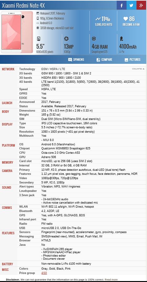 Τεχνικά Χαρακτηριστικά Redmi Note 4X (Mido)