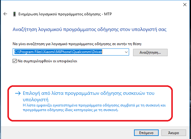 3. Επιλέγουμε το "Επιλογή από λίστα προγραμμάτων οδήγησης συσκευών του υπολογιστή"