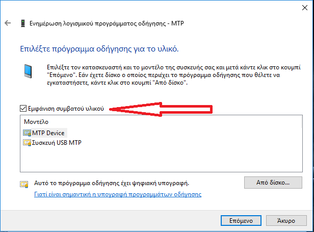 4. Αποτσεκάρουμε το "Εμφάνιση συμβατού υλικού"