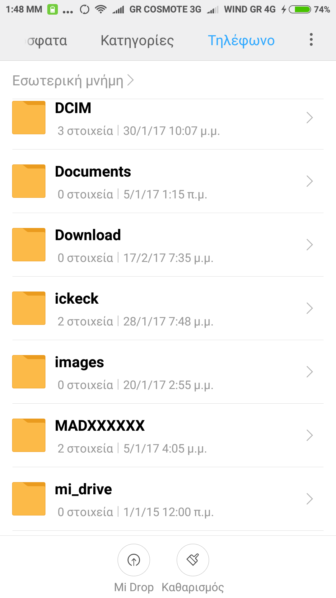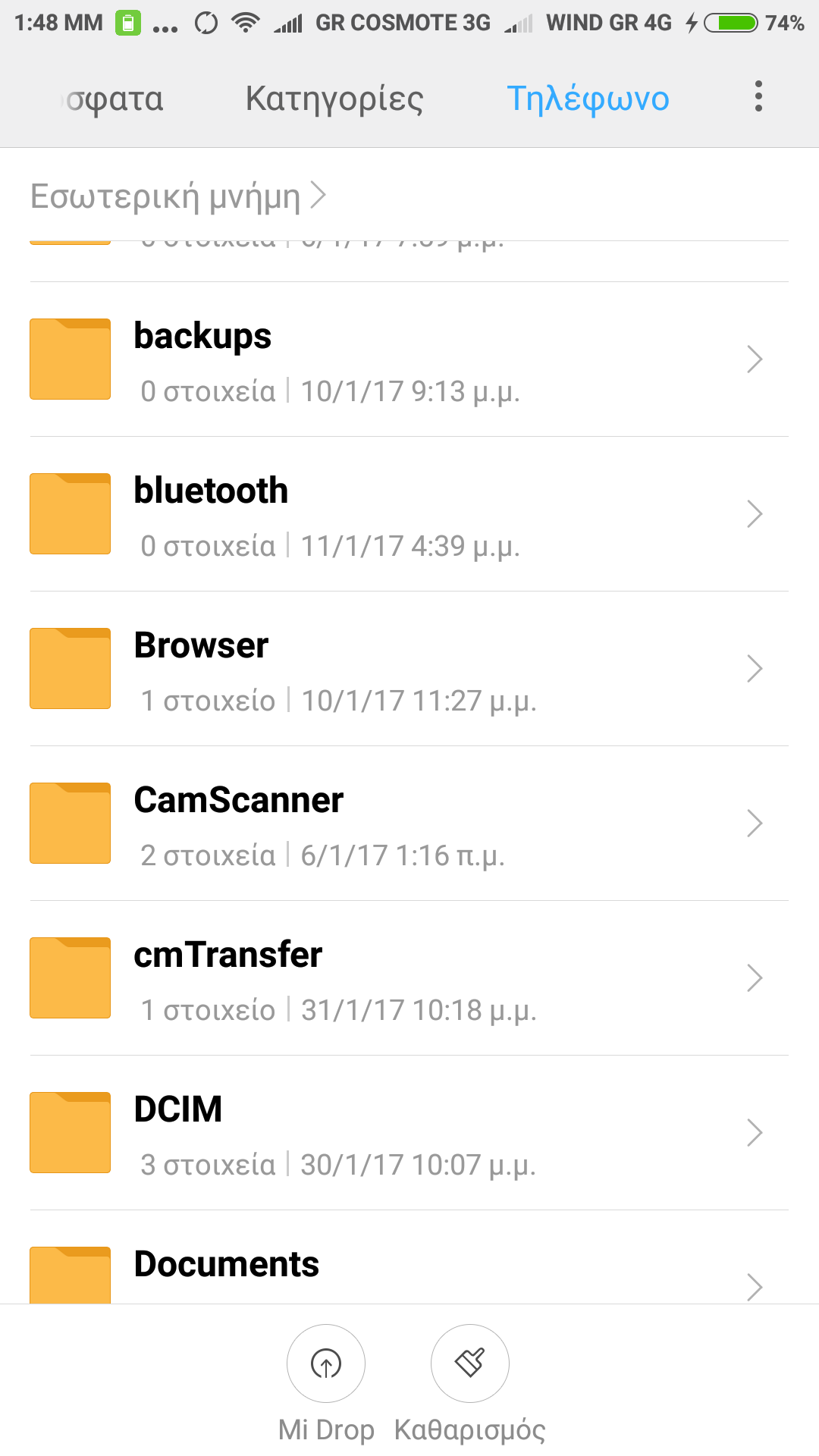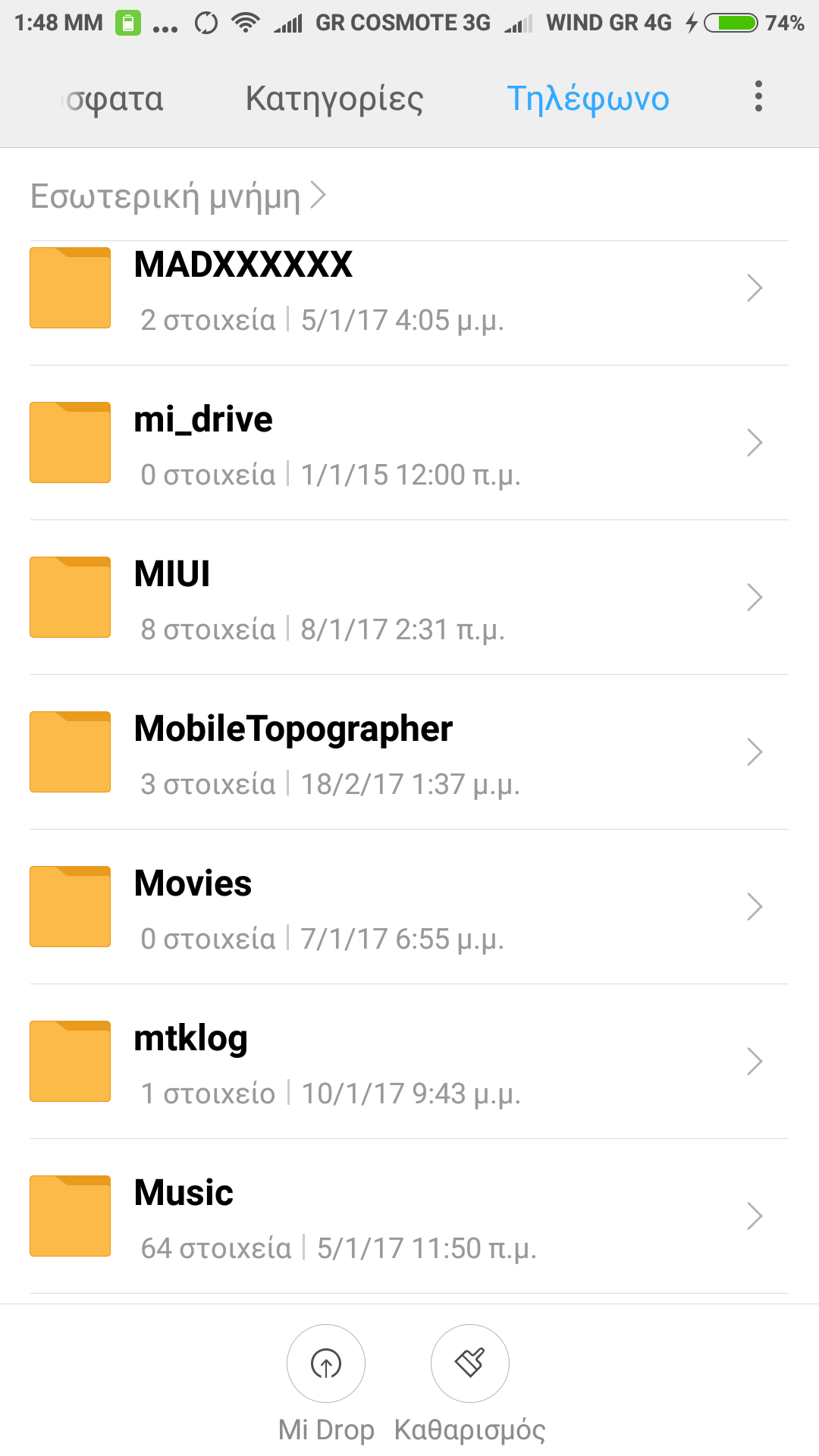 Το πρώτο είναι ότι δεν εμφανίζει στον explorer των Windows 10 X64 όλα τα αρχεία που υπάρχουν μέσα στο τηλέφωνο όταν συνδέω αυτό με καλώδιο στον υπολογιστή , Ενω μεσα sτον file explorer του τηλεφώνου τα βλέπω. Επισυνάπτω φωτογραφίες απο τα αρχεία του τηλεφώνου που ορισμένοι φάκελοι που δημιουργήθηκαν απο εφαρμογή που χρησιμοποιω καθημερινα (Mobile topographer) .