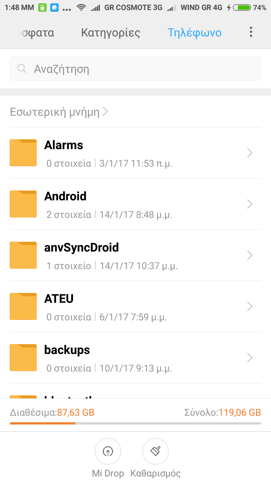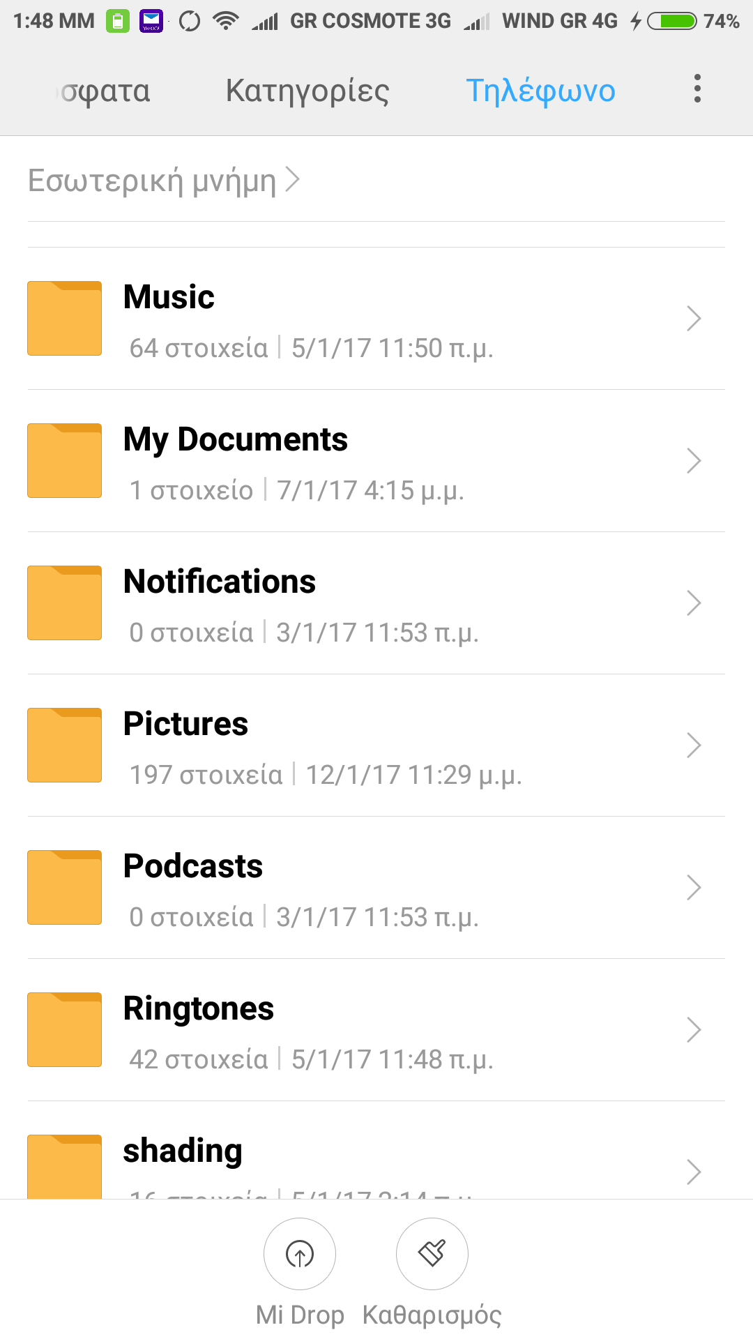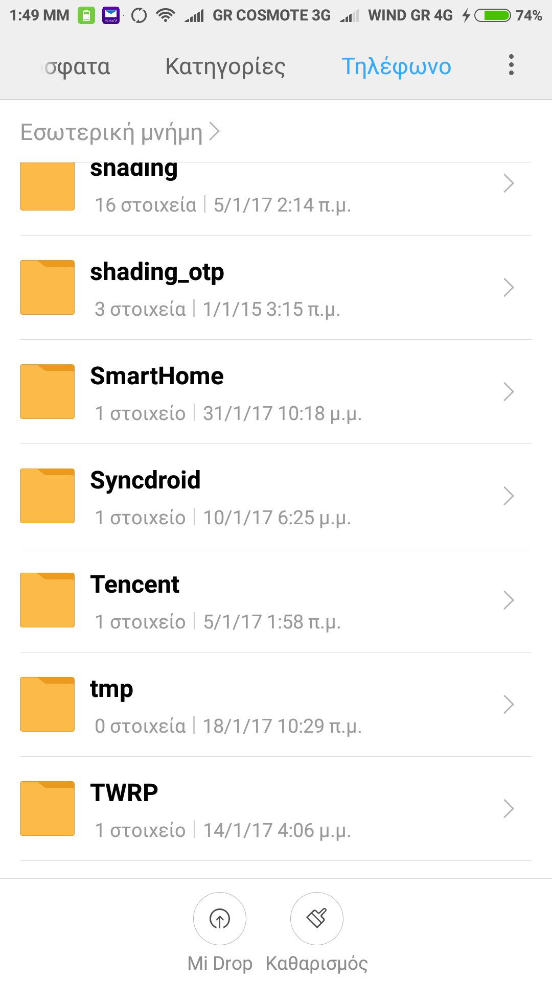 Το πρώτο είναι ότι δεν εμφανίζει στον explorer των Windows 10 X64 όλα τα αρχεία που υπάρχουν μέσα στο τηλέφωνο όταν συνδέω αυτό με καλώδιο στον υπολογιστή , Ενω μεσα sτον file explorer του τηλεφώνου τα βλέπω. Επισυνάπτω φωτογραφίες απο τα αρχεία του τηλεφώνου που ορισμένοι φάκελοι που δημιουργήθηκαν απο εφαρμογή που χρησιμοποιω καθημερινα (Mobile topographer) .