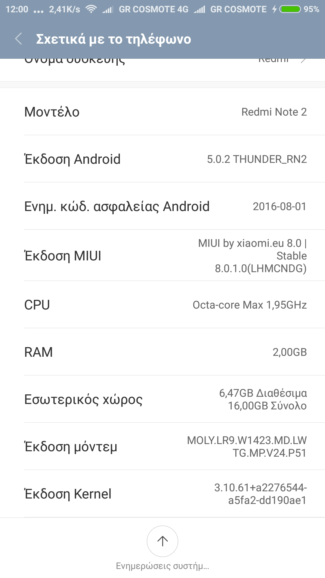 καλημερα σε ολους. επειδη δεν μπορεσα να βρω αλλο θεμα ανοιγω εγω. αν υπαρχει ομως μπορειτε να με μεταφερεται εκει. παιδες το τελευταιο διαστημα εχω προβλημα με τη μπαταρια. κραταει ελαχιστα. χωρις ιδιαιτερη χρηση του κινητου. Σε ενα 20λεπτο το πολυ απο τη φορτιση μπορει να πεσει 30 με 40% χωρις χρηση. πριν καμια βδομαδα και παραπανω εβαλα μια καινουρια ρομ την οποια θα σας επισυναψω. πριν απο αυτη ειχα μια αλλη ελληνικη την οποια δεν θυμαμαι αλλα ηταν και αυτη stable βασισμενη στο miui 6. προβλημα με τη μπαταρια ειχα αρχισει να εχω απο εκεινη τη ρομ. μπορει καποιοσ να βοηθησει? να γνωριζεται οτι εχω 2 μπαταριεσ και με τις 2 εχω το ιδιο προβλημα.
