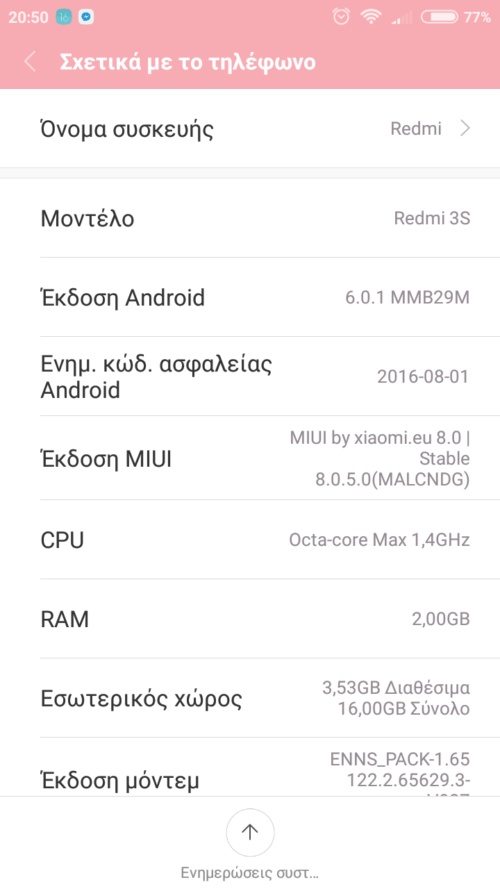 Καλησπέρα σας..Εχω στην κατοχή μου το redmi 3s το είχα πάρει από σκρουτζομαγαζο.εχει multi language και ελληνικά μεσα απο το μαγαζί..η έκδοση του είναι miui 8.0 stable 8.0.5.0(malcnde) μάλλον δεν έχει ota update θα ήθελα να ρωτήσω πιο update και πιο τρόπο να επιλέξω...μπορώ να βαλω αυτήν(xiaomi-miui-hellas-6.0_land_XTRVbeta1_Stable_V8.1.5.0.zip) Κατευθείαν απο τον updater χωρίς recovery και τέτοια