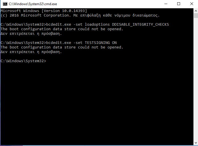 Καλησπερα, θελω να Απενεργοποίησω την ψηφιακή υπογραφής στα Windows χ64 , αλλα δεχεται την πρωτη εντολη ,την δευτερη ομως μου βγαζει αυτο= Συνημμενο .........Τι κανω ?