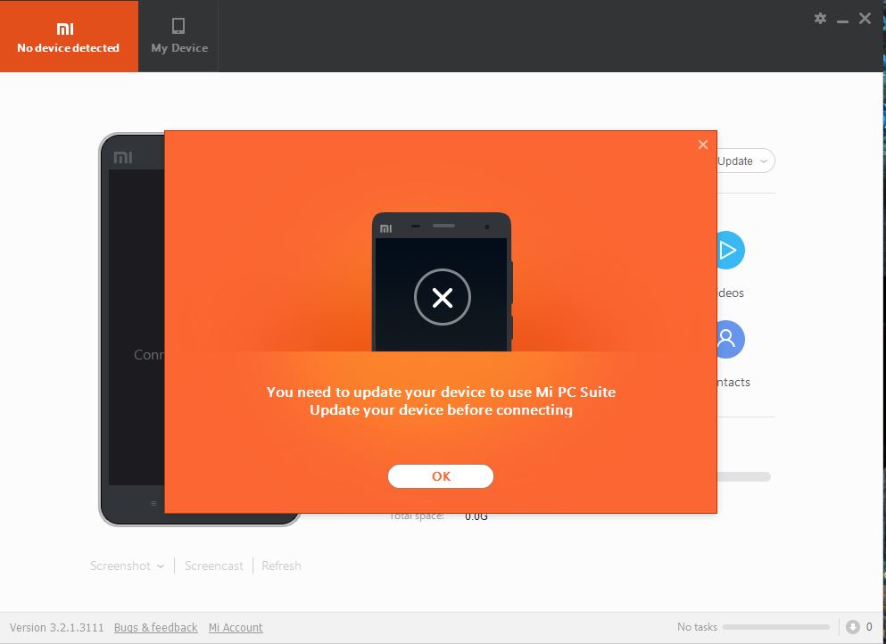 3. Δεν συνδέεται η συσκευή με τον υπολογιστή σε MTP και το MiPCSuite γράφει ότι θέλει αναβάθμιση η συσκευή