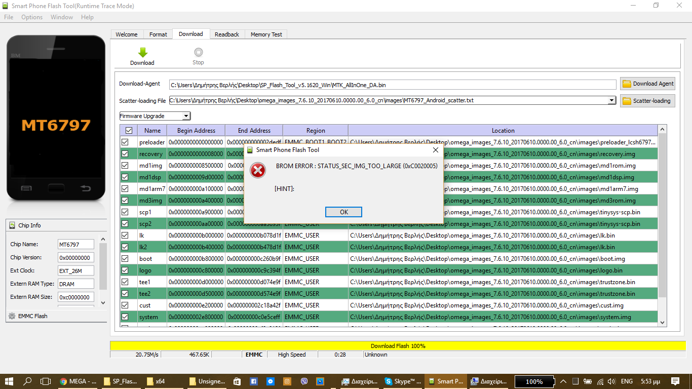 τελικα επελεξα απο τον φακελο του προγραμματος το mtk_allinone_da.bin τωρα περναει την ρομ, βασικα μολις μου εβγαλε brom error status_sec_img_too_large 0xc0020005 -