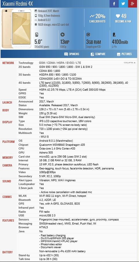 Τεχνικά Χαρακτηριστικά Redmi 4X