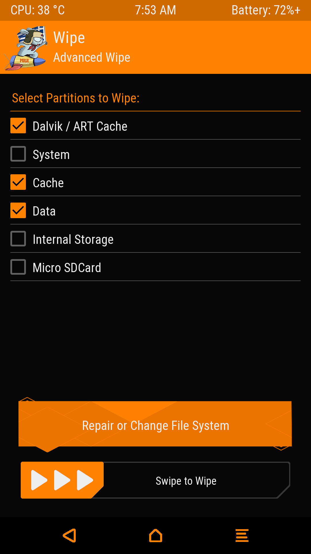 Θα μπούμε στο menu wipe/advanced wipe/τικ σε dalvik art cache,cache,data και swipe to wipe..