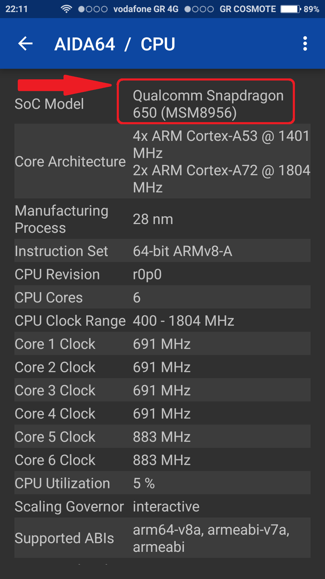Βλέπουμε επίσης αν πατήσουμε στην αρχική σελίδα του AIDA64 το CPU ότι η συσκευή μας έχει π.χ. Qualcomm Snapdragon και δεν είναι π.χ. ΜΤΚ