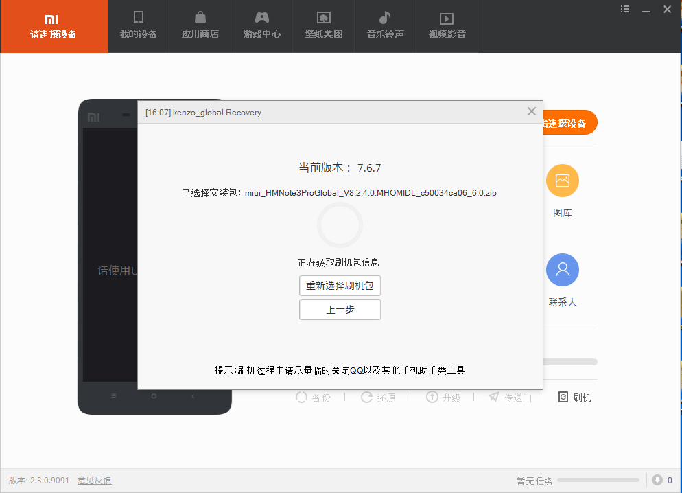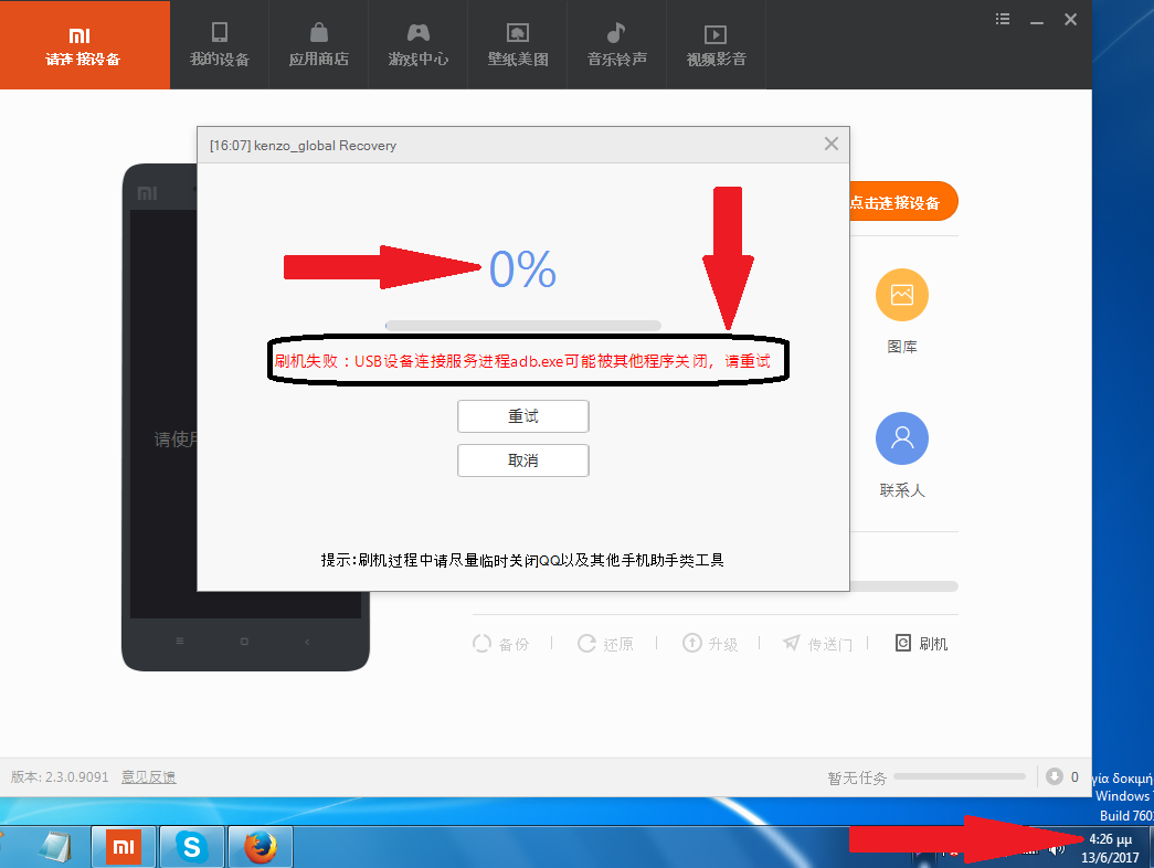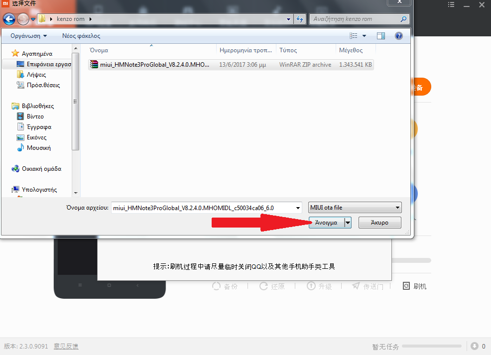 Το Mi Pc Suite Chinese ψάχνει να βρεί την rom μας και να αρχίσει σε λίγο την εγκατάσταση.