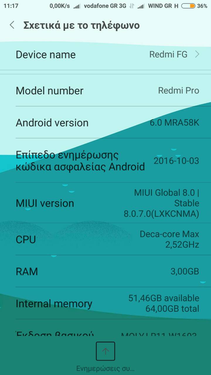 ΚΑΛΗΜΕΡΑ ΑΓΟΡΑΣΑ ΕΝΑ REDMI PRO ΜΕ ADROID VERSION 6.0MRA58K ΚΑΙ MIUI VERSION MIUIGlobal8.0 stable 8.0.6.0.0(MHQCNDG} ΕΚΔΟΣΗ KERNEL 3.18.22+ .ΟΤΑΝ ΨΑΧΝΨ ΓΙΑ ΕΝΗΜΕΡΩΣΕΙΣ ΜΟΥ ΒΓΑΖΕΙ ΟΤΙ Η ΕΚΔΟΣΗ ΜΟΥ ΕΙΝΑΙ