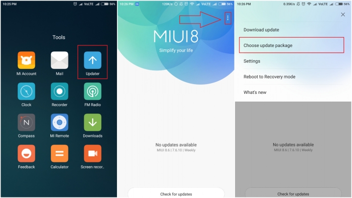 Ανοίξτε την εφαρμογή αναβάθμισης της MIUI (Updater) και κάντε κλικ στις 3 τελίτσες (...) που βρίσκονται στο πάνω δεξί μέρος της οθόνης σας, και επιλέξτε το Choose Update Package (Επιλογή πακέτου αναβάθμισης) από το μενού που θα ανοίξει.