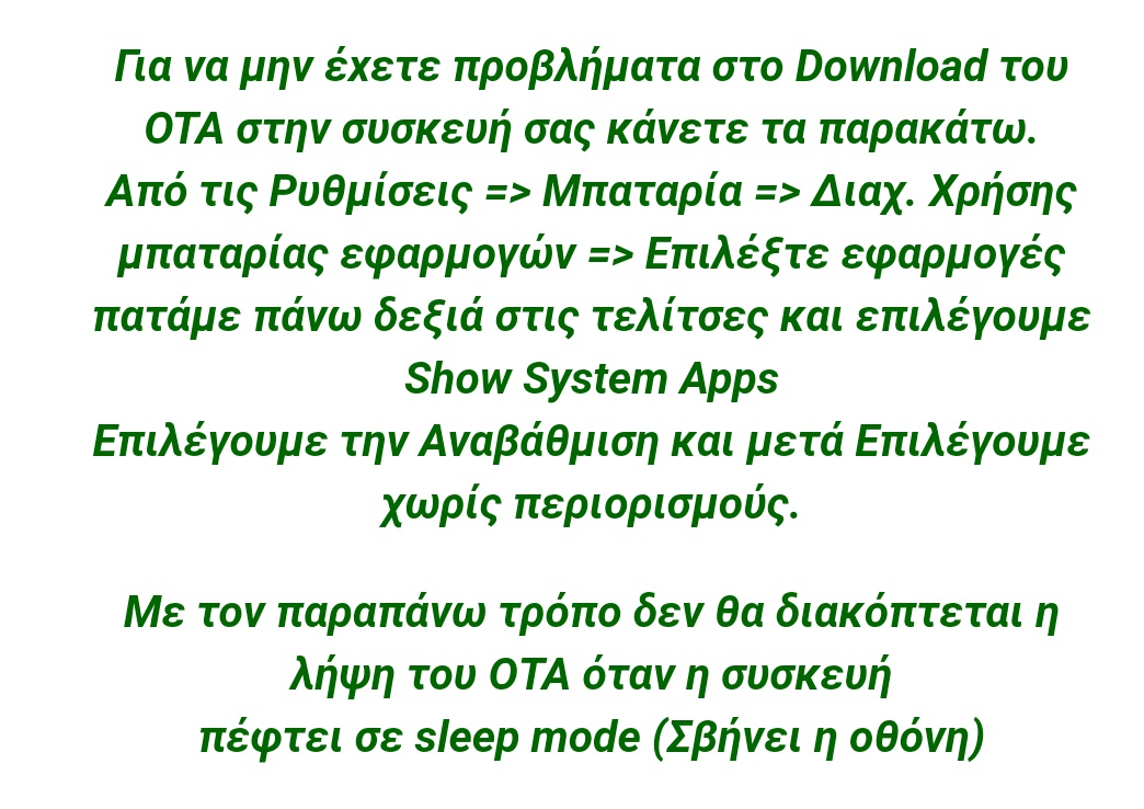 Για να ενεργοποιηθούν τα ΟΤΑ Updates, θα πρέπει πρώτα να κάνετε FLash μία από τις ROM που σας στέλνουμε με τα VIP mail.Ο/H Sakis Teleios έγραψε: