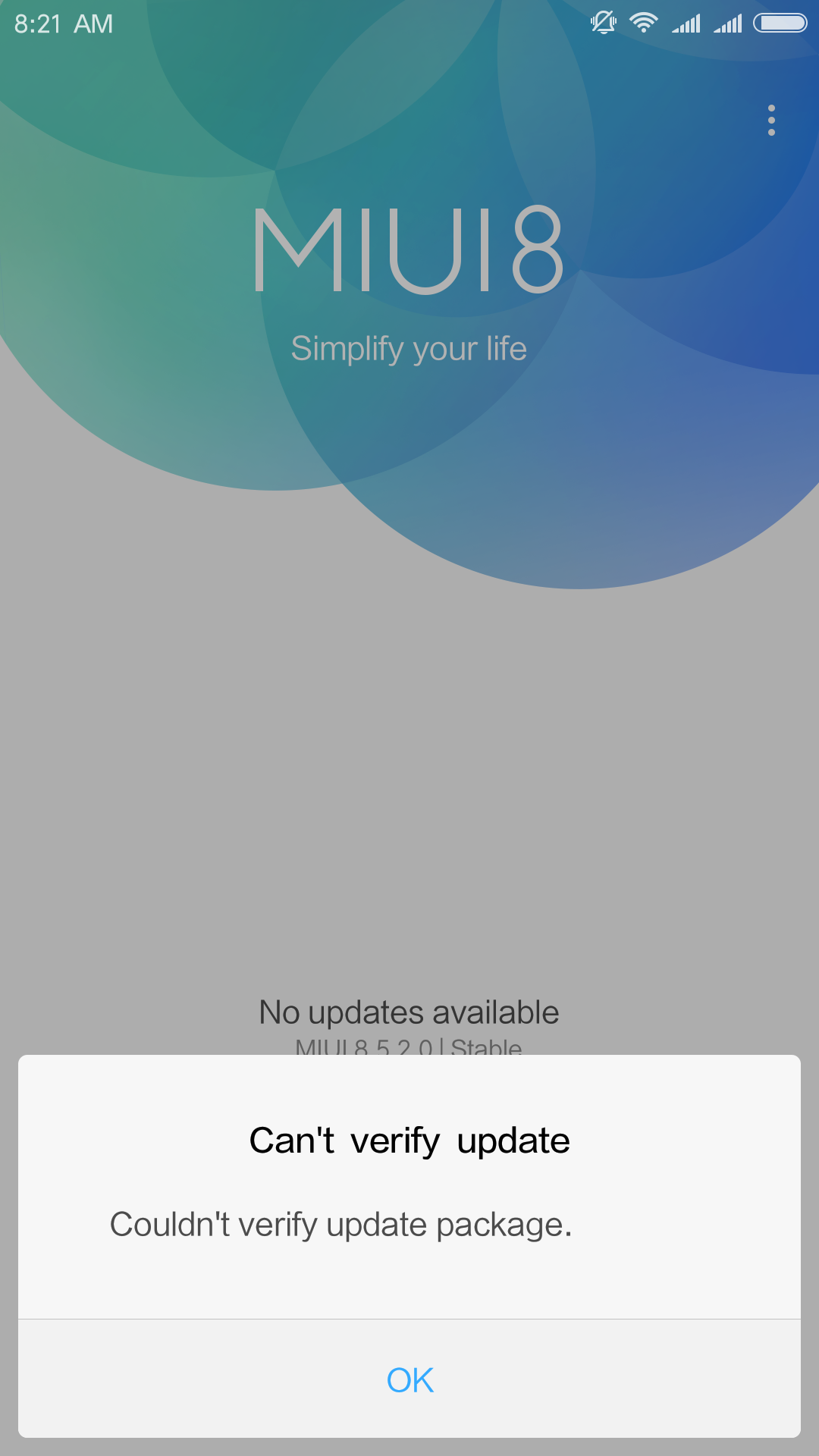Χρειάζομαι λίγο την βοήθεια σας, στο κινητό μου έχω την MIUI 8.5 (LHNCNED) επειδή είναι κινέζικη έχω σοβαρά προβλήματα με τα app, προσπάθησα να βάλω την V8.5.3.0.MHOCNED (MIUI8) Global, αλλά μου βγάζει το μήνυμα που επισυνάπτω στην φωτογραφία "Can't verify update". Δυστυχώς δεν έχω unlock το bootloader μου. είχα κάνει ένα αίτημα παλαιότερα αλλά απορρίφθηκε τώρα ξανα έκανα ώστε να βάλω την ελληνική.