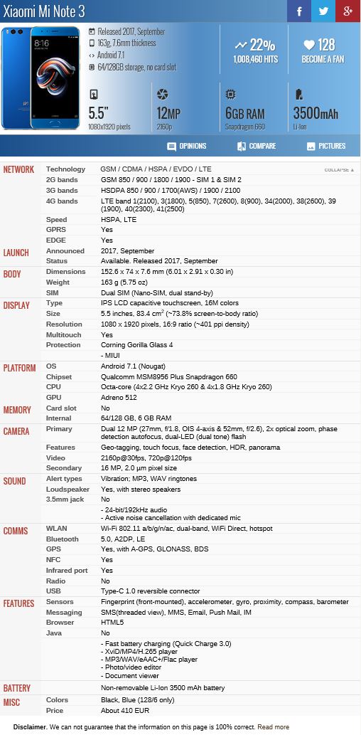 Καρφιτσωμένο Τεχνικά χαρακτηριστικά Mi note 3 (Jason)