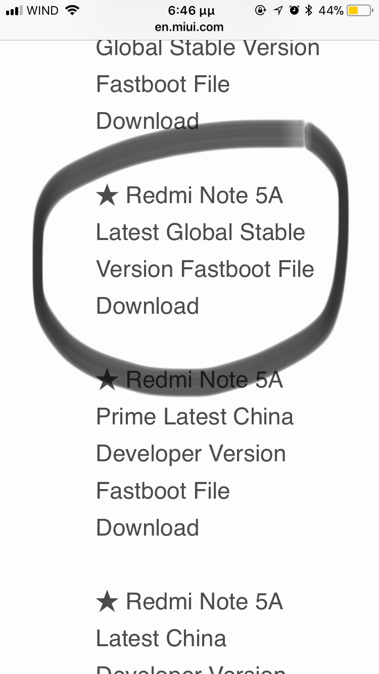 Μόλις ξεκλειδώσεις θα πας εδώ και θα βρεις τη rom για το κινητό σου ( Redmi Note 5A Latest Global Stable Version Fastboot File Download) για να τη κατεβάσεις στον υπολογιστή σου.
