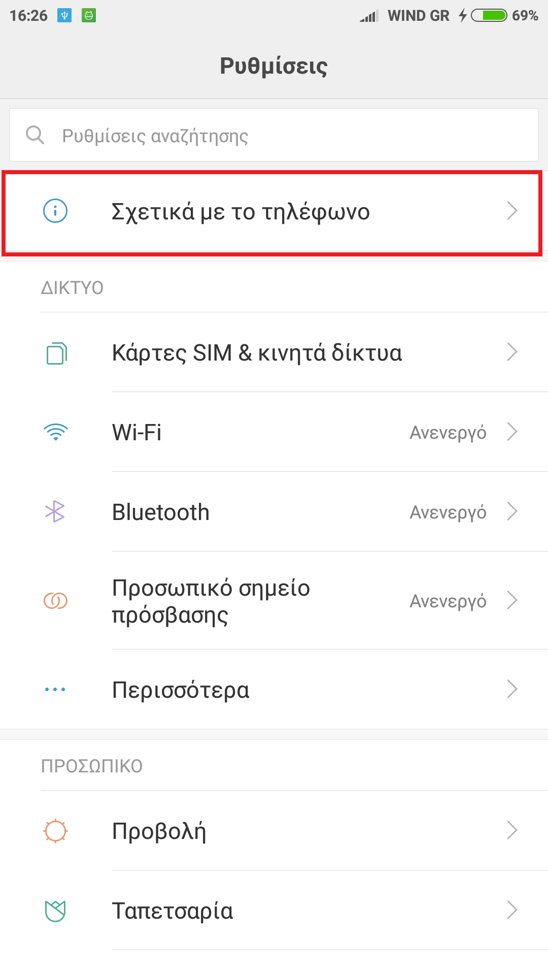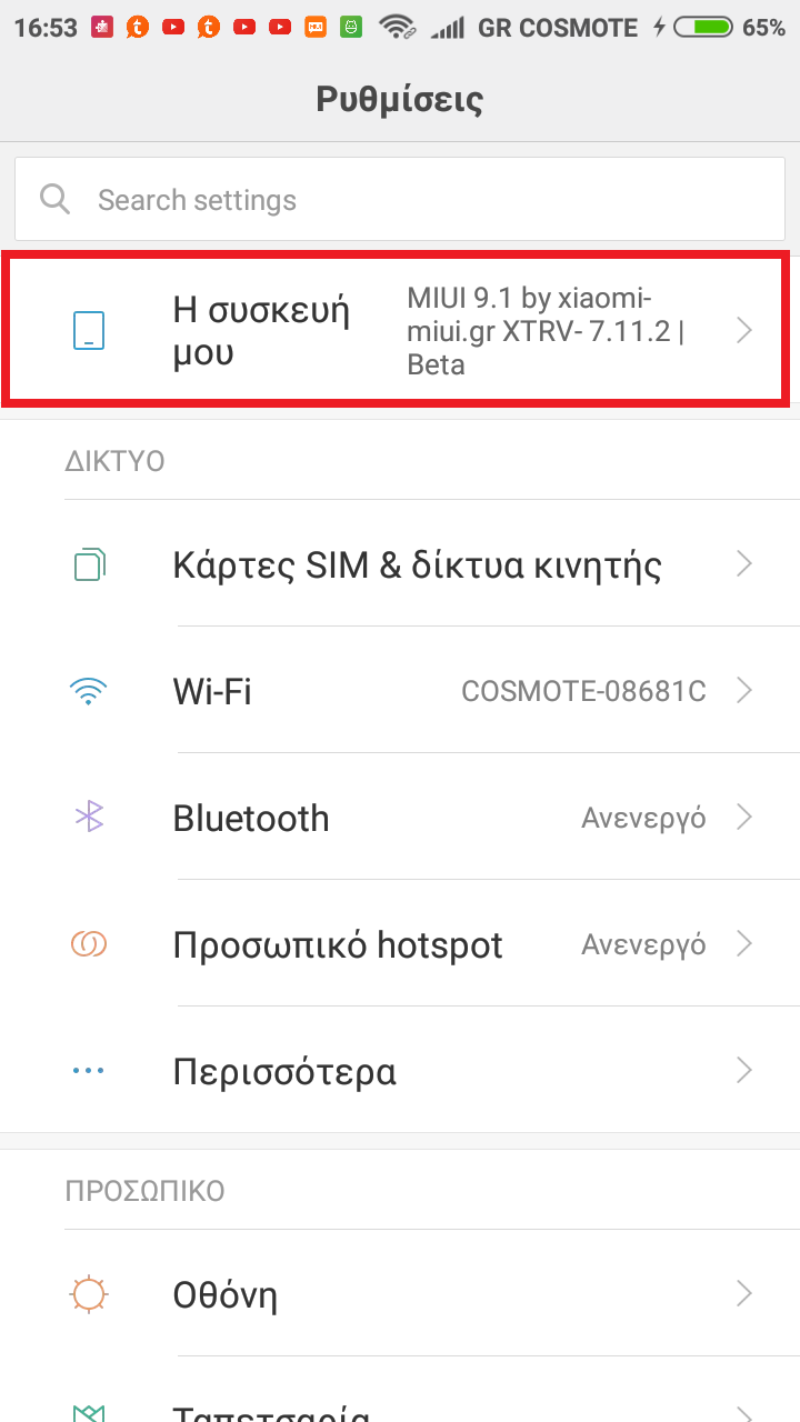 Εδώ μπορείτε να βρείτε και να ελέγξετε όλα όσα σχετίζονται με το δίκτυο, προϊόντα, πληροφορίες μπαταρίας, στατιστικά στοιχεία γύρω από την συσκευή σας.