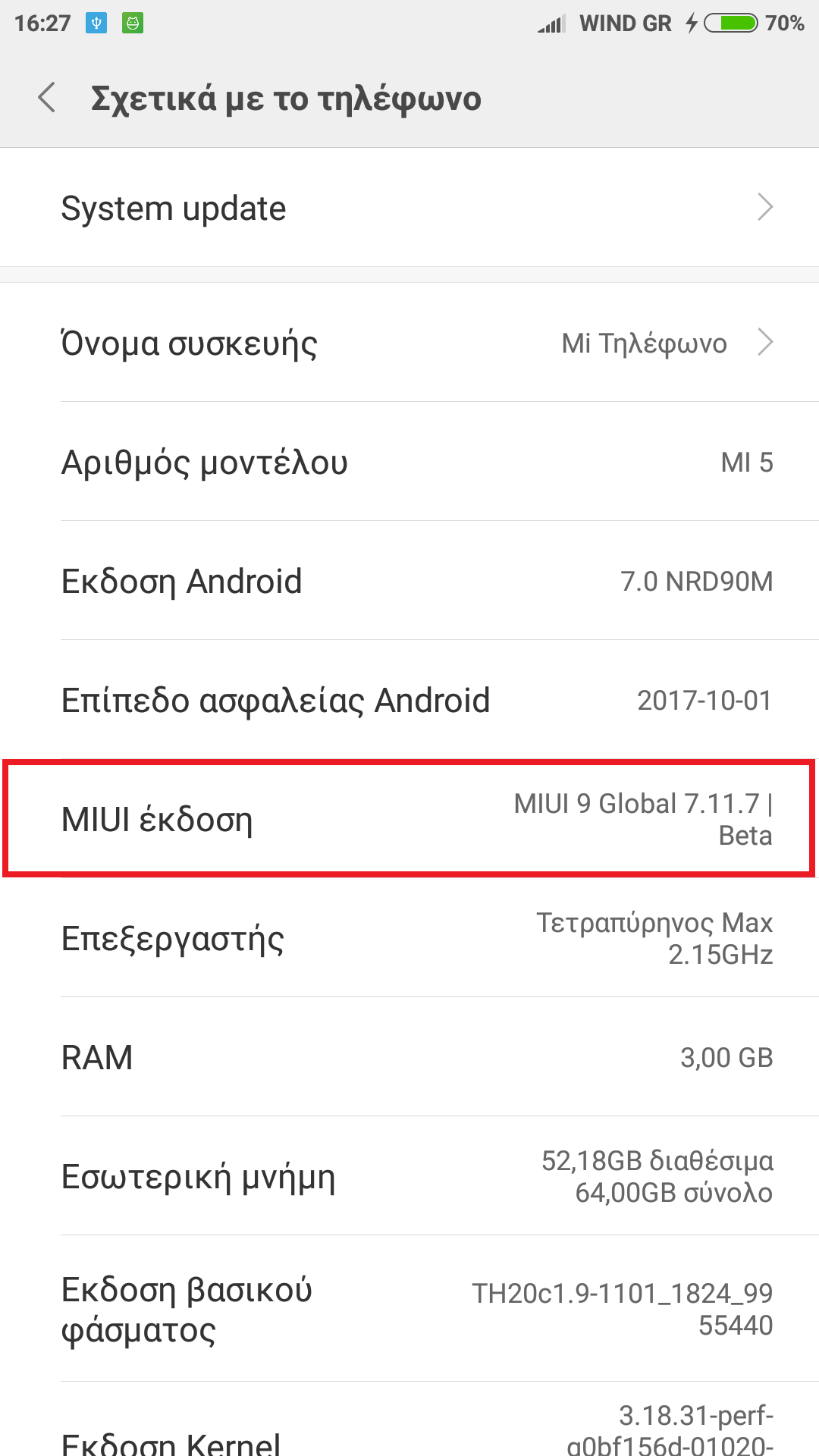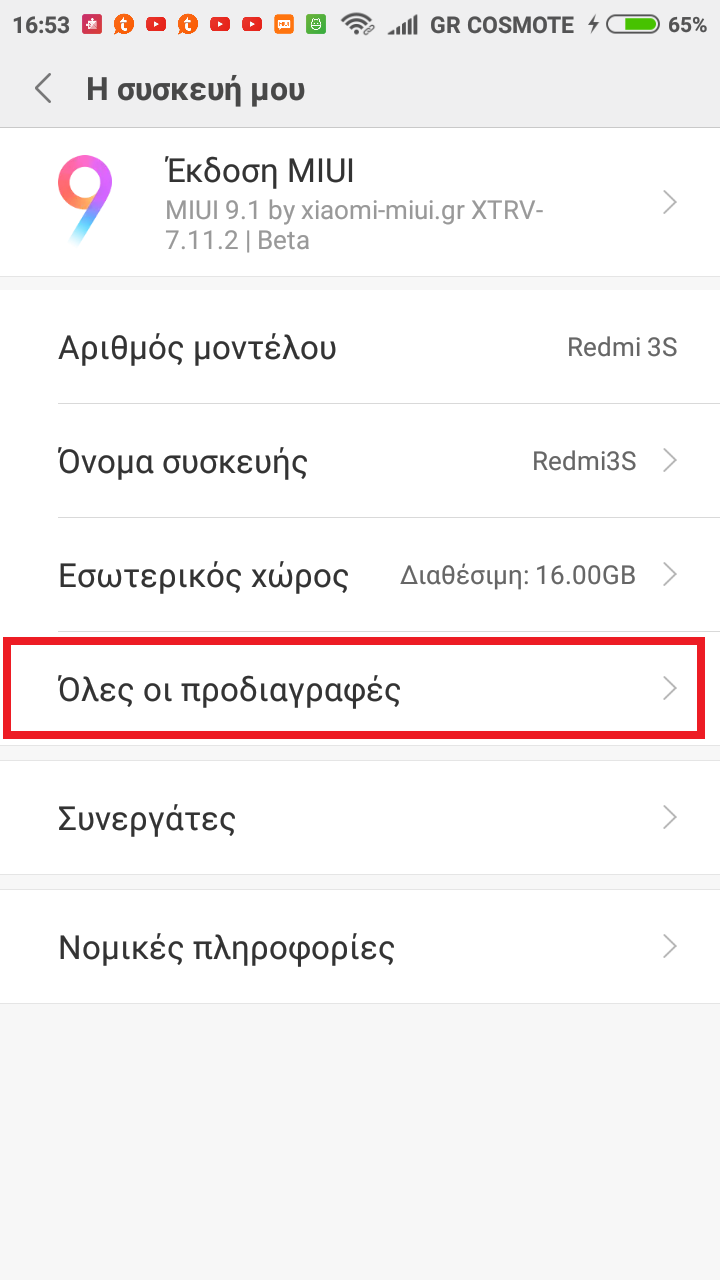 Πατήστε την έκδοση MIUI επτά φορές για να ενεργοποιήσετε τις επιλογές προγραμματιστή. Για αυτό πηγαίνετε Ρυθμίσεις - (για china rom ή XTRV) Η Συσκευή μου - Όλες οι προδιαγραφές - Έκδοση Miui, (για Global rom) Σχετικά με το τηλέφωνο - Miui έκδοση.