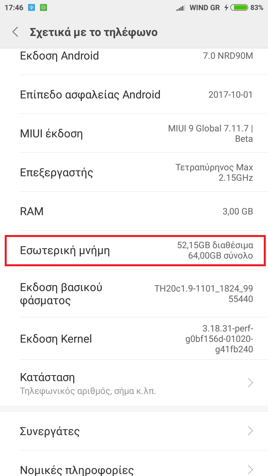Ρυθμίσεις - Η συσκευή μου - Όλες οι προδιαγραφές μου - Συνολική μνήμη για china ή XTRV rom, Ρυθμίσεις - Σχετικά με το τηλέφωνο - Εσωτερική μνήμη για Global rom.