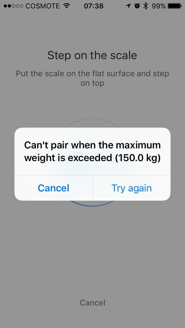 Ενώ ζυγίστηκε την πρώτη φορά με τη ζυγαριά, έκανε pair με το κινητό του και πέρασε την 1η μέτρηση στην εφαρμογή (IOS), από το σημείο αυτό και μετά η ζυγαριά του βγάζει συνέχεια πρόβλημα ότι έχει υπερβεί το μέγιστο βάρος (327,6 kgr η ένδειξη στο κινητό).