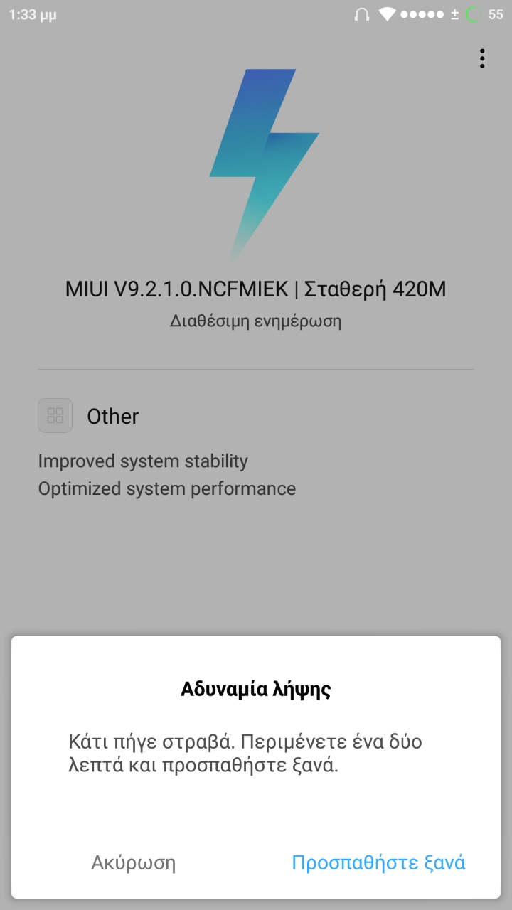 Καινούργιος στο φόρουμ...μόλις πριν λίγες μέρες πήρα και καινούργιο κινητό... xiaomi RedMi Note 4... Σήμερα καθώς πήγα να κάνω την διάθεσιμη ενημέρωση που είχε ( MIUI V9.2.1.0 NCFMIEK/ σταθερή 420Μ) έφτανε μέχρι το 30% και μετά με έβγαζε αδυναμία λήψης...σας το παραθέτω και σε φωτό... Και επίσης στην σάρωση ιού το παρακάτω που φαίνεται στη φωτογραφία...Γνωρίζει κανείς γιατί συμβαίνει αυτό; Πως μπορώ να το λύσω;