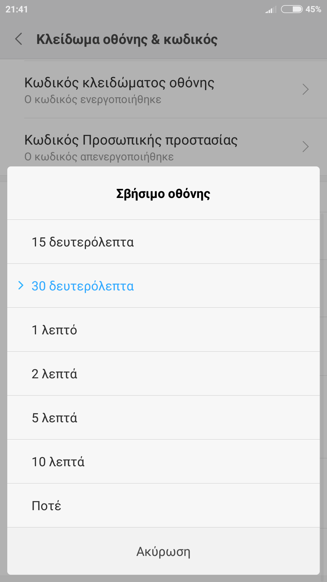 Ρυθμίσεις>Κλείδωμα οθόνης>Σβήσιμο οθονης