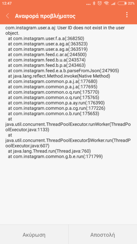 Καλησπέρα σας, αντιμετωπίζω θέμα με το Instagram app. Ενώ ανοίγει κανονικά η εφαρμογή, κλείνει αμέσως και δε με αφήνει να στείλω ούτε αναφορά. Η συσκευή μου είναι Redmi Note 4, android7.0NRD90M, MUI έκδοση MUI Global 9.2| stable 9.2.1.0(NCFMIEK), Kernel 3.18.31-perf-g021e4fd. Είχα κάνει πρόσφατα μια ενημέρωση, αλλά το πρόβλημα δεν εμφανίστηκε αμέσως, οπότε δεν ξέρω αν σχετίζεται με αυτό. Το περίεργο είναι ότι το κάνει μόνο με τον προσωπικό μου λογαριασμό. Έχω και 3 business accounts μέσα τα οποία δεν παρουσιάζουν κάποιο θέμα όταν συνδεόμαι. Σας επισυνάπτω και το report που βγάζει και μάλλον έχει να κάνει με τον user. Με συγχωρείτε αν έχει ξαναγίνει η ερώτηση. Σας ευχαριστώ.