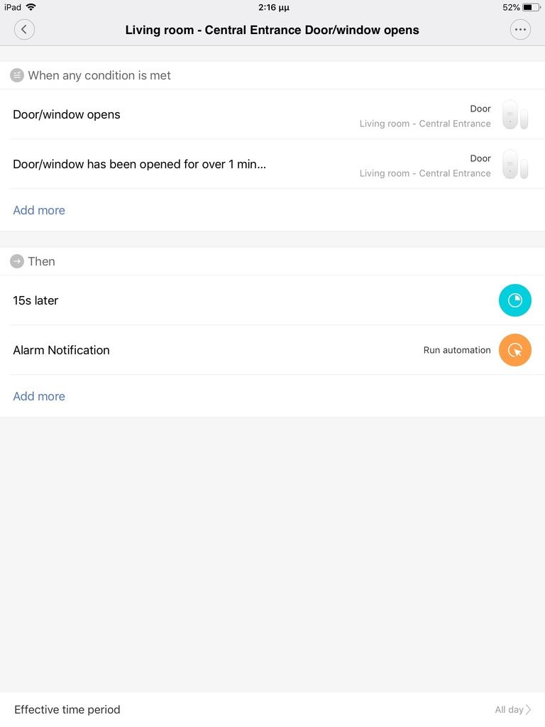 Όταν φεύγεις τον οπλιζεις τον συναγερμό; Γιατί αν είναι οπλισμένος και ανοιξεις την πόρτα θα χτυπήσει ο συναγερμός. Αυτό που έκανες δεν κατάλαβα σε τι σε χρησιμεύει. Απλά όταν μπαίνεις σπίτι μετά από 15 Δευτέρα χτυπάει το gateway.