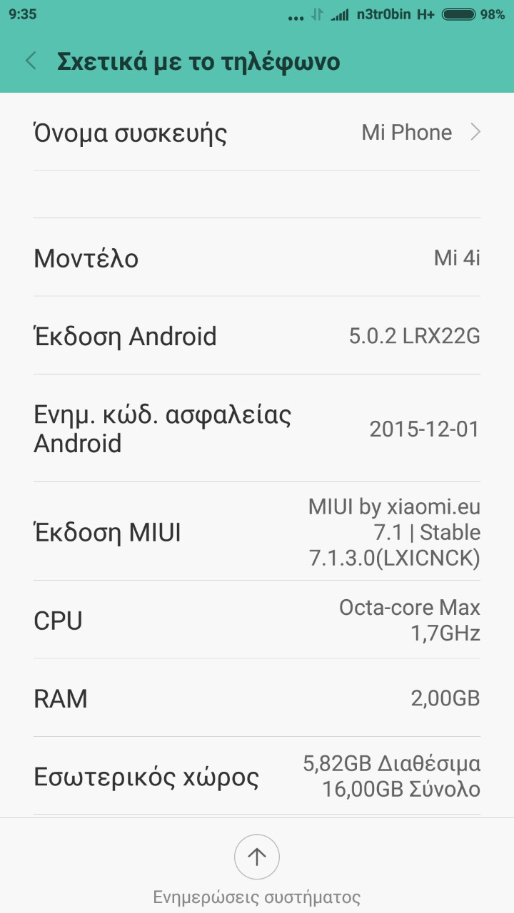 Καλησπέρα σε όλη την κοινότητα και καλή Χρονιά να έχουμε παιδιά και απο εμένα! Έχω το mi4i εδω και κανα χρόνο αλλά μου κάνει συνέχεια προβλήματα με την εφαρμογή youtube και ενω την έχω εγκαταστήσει και απεγκαταστήσει έχω σβήσει τα data της και την cache συνεχίζει ακάθεκτα....το θέμα είναι το εξής.καθε φορά που πάω να παίξω ένα βίντεο και συγκεκριμένα μετά τις διαφημίσεις το βίντεο σταματάει και μπαίνει σε φάση αναμονής.σαν να περιμένει δηλαδή να ξαναπατήσεις εσυ play.Να αναφέρω πως το έχω τσεκάρει πάνω απο 6 μήνες τώρα και σε άπειρα δίκτυα με wifi ή 4g σήμα,σε κλειστούς και ανοικτούς χώρους, βάζοντας την sim απο το slot1 στο 2 και αντίστροφα καθώς επίσης και επαναφορά εργοστασιακών ρυθμίσεων και όλων των ειδών τα hard reset χωρίς καμία επιτύχια. Άλλες εφαρμογές όπως το vimeo ή αν μπω πχ απο τον browser στην σελίδα youtube δεν συναντάω κανένα απολύτως πρόβλημα σαν αυτό που ανέφερα.τα βίντεο παίζουν απροβλημάτιστα.σας επισυνάπτω μια εικόνα με τα χαρακτηριστικά απο το κινητό μου με το τι ROM φοράει μιας και το έχω τελείως μαμά απο εκεί που το παρέλαβα,ωστε να μου πείτε αν τυχόν είναι θέμα προβληματικής ROM και αν ναι πρέπει να βάλω την Rom που πέρνει το mi4 ή το mi4s ή θα έχω θέμα γιατι αν και ασχετος επι του θέματος τα διαφορετικά specs που έχουν τα 3 αυτά μοντέλα δεν με αφήνει και πολύ ήσυχο.