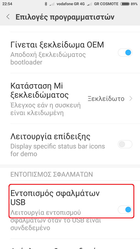 Βάλτε το κινητό σας κανονική λειτουργία και κάνετε ότι στην φωτογραφία πηγαίνετε Ρυθμίσεις ----> Σχετικά με το τηλέφωνό και χτυπήστε 7 φορές με το δάχτυλό σας στο MIUI έκδοση να σας κάνει διαχειριστή,στην συνέχεια γυρίστε πίσω και στης Ρυθμίσεις αναζητήστε της Πρόσθετες ρυθμίσεις και τρίτο πριν το τέλος είναι το Επιλογές προγραμματιστών και ενεργοποιήστε τον Εντοπισμό σφαλμάτων USB